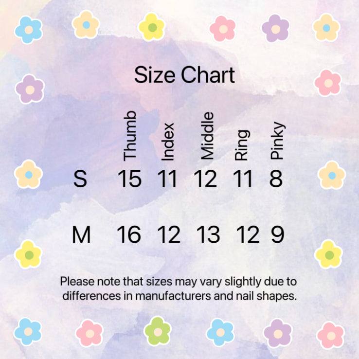 Our nail size chart provides standard measurements to help you find the perfect fit. However, please note that small variations may occur due to differences between manufacturers, as well as the unique shapes and designs of each nail set. We recommend reviewing the chart carefully before making a purchase to ensure the best fit for your nails.